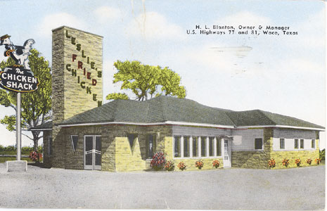 "The Chicken Shack Specializing "Leslie's Fried Chicken" Located at City Limits of Waco, Texas, on U. S. Highways 77 to Dallas and 81 to Fort Worth. Come as you are traveling; everybody welcomed. No food is more enjoyable than Leslie's Fried Chicken. Take it with you, packed in a neat box." Card No. 25071N, Postmarked 1953.