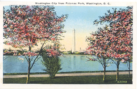 "Washington City from Potomac Park, Washington, D.C. along Riverside Drive is very beautiful. Many of the government buildings can be seen across the water." One Cent Post Card No. 23508.