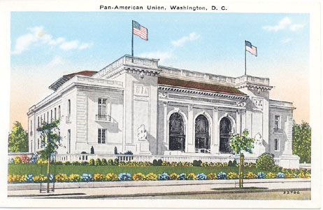 Pan-American Union, Washington, D. C. is maintained by the twenty-one American Republics including the United States, for the development of Pan-American commerce, friendship and peace. This new building completed in April, 1919, cost $1,000,000." One Cent post cardno. 33786.