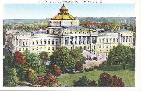 Library of Congress, Washington, D. C. "Justly celebrated as the culmination of architectural achievement of the day. Was completed in 1897 at a cost of over $6,000,000. The Library is here seen from the Capitol. The dome and lantern are finished in black copper, with panels gilded with thick coatings of gold leaf; and the cresting of the dome terminates in a gilded finial representing the torch of science ever burning." One-Cent Post Card No. 16748.