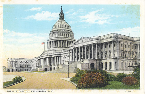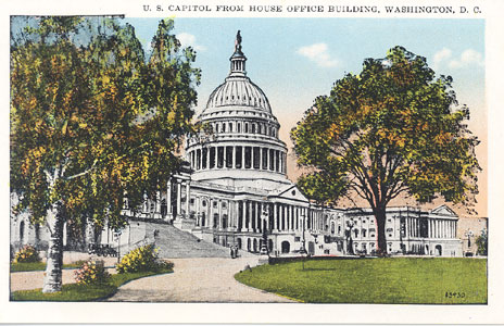 "U. S. Capitol From House Office Building, Washington, D. C., set on a height overlooking the amphitheatre of the Potomac, is one of the largest and stateliest buildings in the world. It is 751 feet in length and 359 feet in width, covering three and a half acres. The statue of Freedom on the dome towers 307 feet above the esplanade. The cornerstone was laid by President Washington in 1793; the central building was finished in 1797; and the extensions were first occupied by Congress in 1857." One Cent Post Card No. 13430.