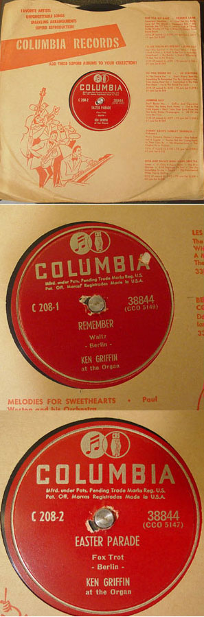 Easter Parade Fox Trot -Berlin- and Remember Waltz -Berlin- both played by Ken Griffin and the organ. Columbia red label no. C 208-1 & C 208-2, 38844.