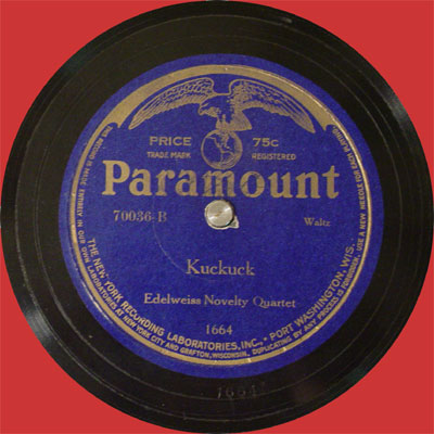 Kuckuck with the Edelweiss Novelty Quartet. 70036-B Paramount label no. 1664. Produced by The New York Recording Laboratories, Port Washington, Wisconsin. List price when new was seventy-five cents.