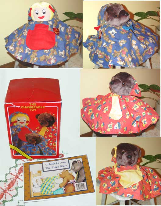 Changeable Toy by The Reinhart Collection. Goldilocks and the Three Bears, a flip doll that includes all three bears and Goldilocks. Includes a 24 page full color book "Goldilocks and the Three Bears", retold by Tricia Lee, Illustrations by Elizabeth Alger.