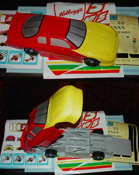 A plastic Chevrolet Monte Carlo manufactured by Sasco that is approximately 12 inch long. It was purchased from Kellogg's and has decals to make it look more realistic. The top of the car lifts up and reveals storage for Matchbox(R) or Hotwheel(R) type cars.