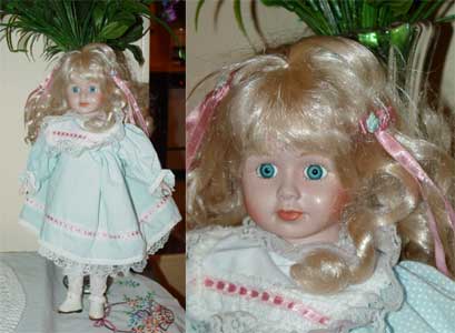 A 16 inch porcelain doll from Seymour Mann, dated 1992. This sweet looking girl is part of the Connoissuer Collection series. She is wearing her blonde hair in curls and has beautiful bright blue eyes. She has on a pretty light blue dress with tiny white polka dots trimmed in white lace and pink ribbon.