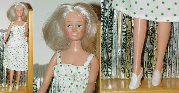 A "Barbie clone" who is somewhere over 25 years old made by M & S Shillman. Stamped "M & S Shillman made in Hong Kong" on her back. Her white cotton sundress with green polka dots is not tagged but appears to be from the same era as the doll. She is wearing her original white high-heel shoes. When examining the doll it is obvious that she is a lesser quality than an authentic Barbie doll.