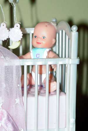 This baby doll is only 2.5 inches tall and comes with molded on clothes. His bib has the letter "C" embossed on it. The baby doll is sitting in a Mattel baby bed.