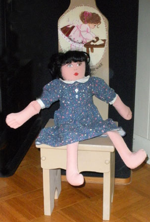 An 18 inch ragdoll from That's My Mommie in Bastrop, Texas. Black yarn hair with a printed face, she is not wearing her original clothes. Made in China.