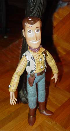 Thinkway Toys, "Woody" from Toy Story. Woody is 11 inches tall without his hat, which is missing. He wears his sheriff's badge and he talks, with batteries, when the 2nd button on his shirt is pressed. He is plush with a vinyl head, hands, boots and belt.