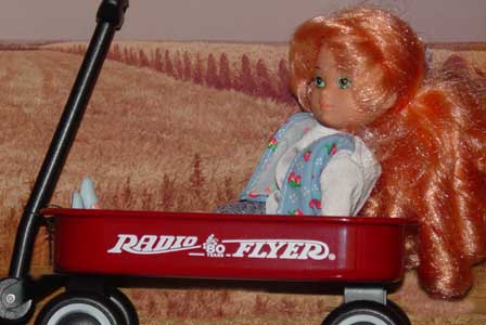 What better place to go for a ride than through a field of freshly baled hay near Copeland, Texas. 1987, red haired, "Lady Lovely Locks" by Those Characters From Cleveland isn't easily recognized when she isn't wearing her original pretty dress.