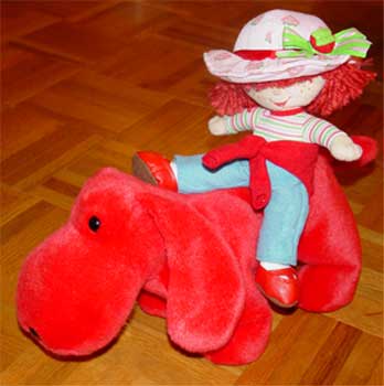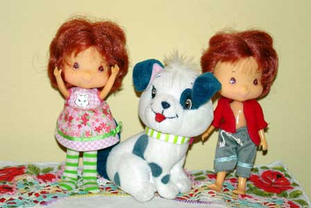 "Strawberry Shortcake" by Those Characters From Cleveland (TCFC). Distributed by Bandai 2002. Neither doll has on her original clothes except for the green and white stripe tights which look like her original ones. Both little dolls are all vinyl, 4.5 inches tall and have the traditional "Strawberry Shortcake red hair". "Pupcake", Strawberry Shortcake's dog is 4 inches tall, copyrighted by TCFC in 2003 and also distributed by Bandai.