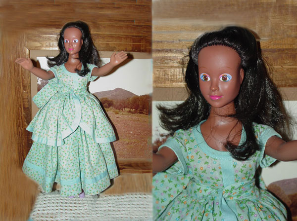 Dressed in a handmade cotton dress this slim 17 inch doll is marked 1990, "Those Characters From Cleveland". Her head is marked 1990, "Tiger". She likes living in her log cabin in the middle of West Texas and is proud of the dress made from flower sacks that her Aunt Jo gave her.