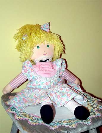 Holly Hobbie copyright 1989 by Those Characters From Cleveland, manufactured by Mattel as a 1st edition, Fancy Treat Holly Hobbie in 1990. Holly Hobbie is an all plush 15 inch doll with yellow yarn hair and painted facial features. Printed on the yoke of her dress is, "You deserve a special treat for being someone extra sweet".