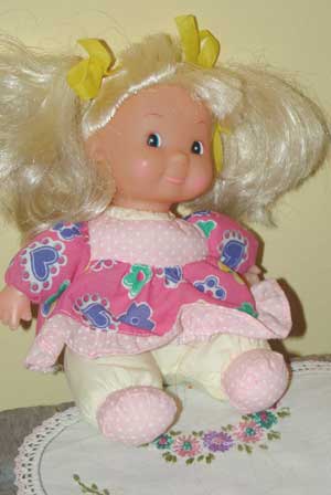 When sitting down this Toy-O-Rama doll measures 6 inches. She is a plush bodied doll with a vinyl head and hands. Her blonde hair is rooted and her eyes are painted on. She is not marked with a date or name. Her clothes are non-removable