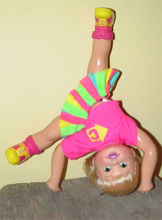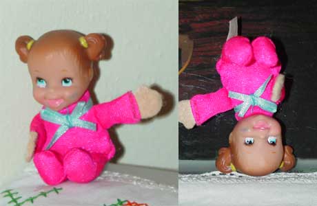 Tagged 1998 on the body and marked 1996 on the head these two dolls by Toy Biz, Inc. are named "Baby Headstand Surprise!" They have a heavy vinyl head which allows them to do headstands easily and without falling over. The clothes are non-removable and are made from nylon fabric.