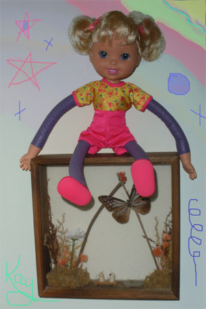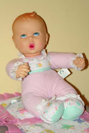 An 18 inch doll by Toy Biz wearing her original clothes. With batteries she talks. She is wearing her original clothes and has blond hair and blue eyes. The bracelet is not original but she really does like wearing it.