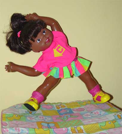 1997 Casey Cartwheel by Toy Biz. This little cheerleader is good at doing cartwheels. She is suppose to have pom-poms in her hands.
