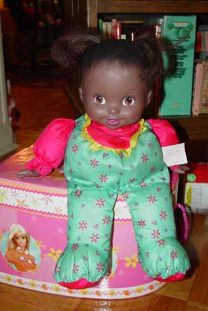 Magic Stroller Baby by Toy Biz, Inc., copyright by Marvel 1997. A black baby with two little pony tails, a vinyl head and vinyl hands. She has a very soft body with non-removable clothes made from a synthetic fabic.