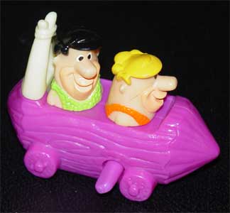 Fast Food toy from Burger King. This car is part of a set of four interactive toys, including a toy that depicts the very first BURGER KING(R) restaurant named "BRONTO KING"as part of its promotional tie in with Universal Pictures' and Hanna-Barbera/Amblin Entertainment's film "The Flintstones in Viva Rock Vegas," which was released in April of 2000. The Burger King promotion started on May 1, 2000. The four toys included Puppy Dino Breaks Out which features a wind-up dinosaur egg that pops open to reveal Puppy Dino walking out of his shell. The Great Gazoo's Close Encounter is a spinning/flashing spacecraft on top of the glow-in-the-dark Tardust Hotel. Fred's Two-Heel Drive winds up and features Fred "hoofing it" with the ultimate gas economy car. And the Bronto King Dine & Drive, the drive through "BK" restaurant, complete with Fred in a wind-up car that actually proceeds to the pick up window. This is Fred's wind-up car but the drive through BK restaurant is missing. Visit the Burger King site: Burger King and learn more about Burger King and their fast food toys.