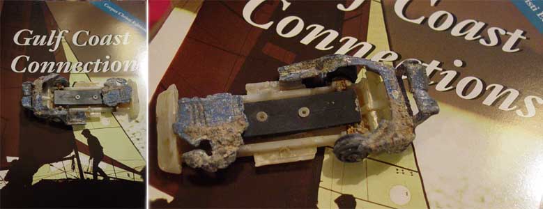 After being tumbled in the tide and rolled in the sand the make and model of this car is no longer recognizable. Marked "S8565F" and "Made in China" there is little left of this vehicle after being ravaged by the Gulf of Mexico. The two rear tires, the spoiler, blue paint, and the hood along with the white plastic bottom are the sum total of this toy vehicle.