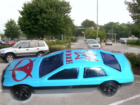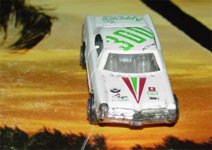 A white mini toy car that isn't marked with a brand or manufacturer, "made in China". The car has a big decal on the top "300" and decals on the hood and trunk that say "Fight Approve Action".