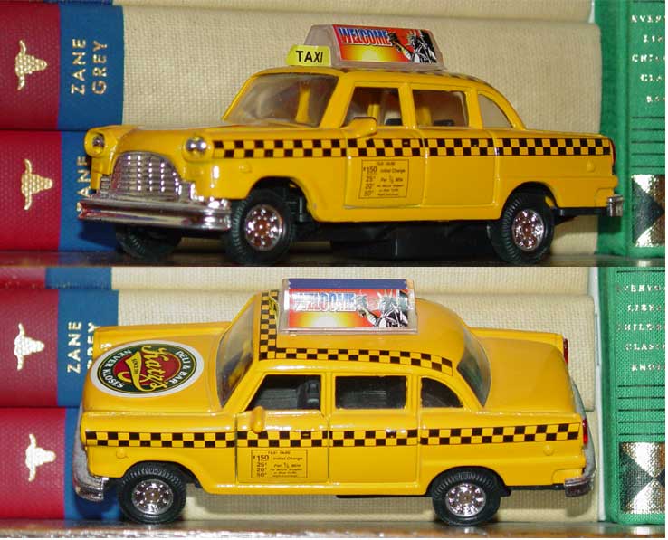 A yellow taxicab advertising Katz's Deli "Katz's Never Kloses".