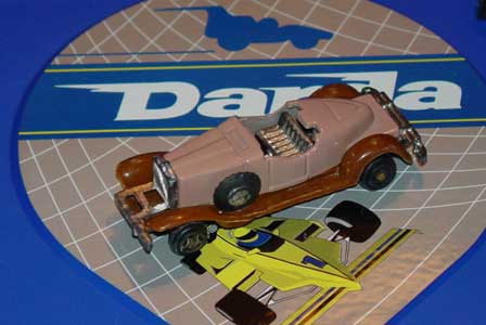 A white mini toy car no. 304 that isn't marked with a brand or manufacturer, "made in China". The car is made to resemble an antique 1920s era car.