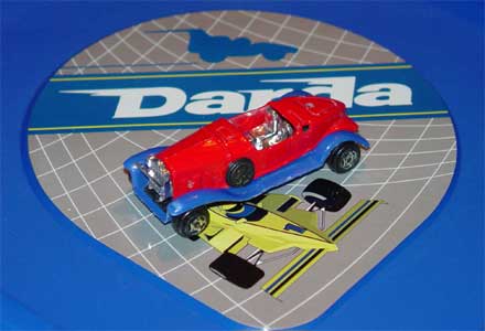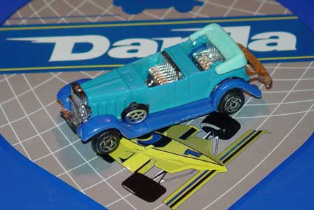 A blue plastic "Matchbox" size car. Marked 932H with a check inside a star on the top.