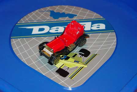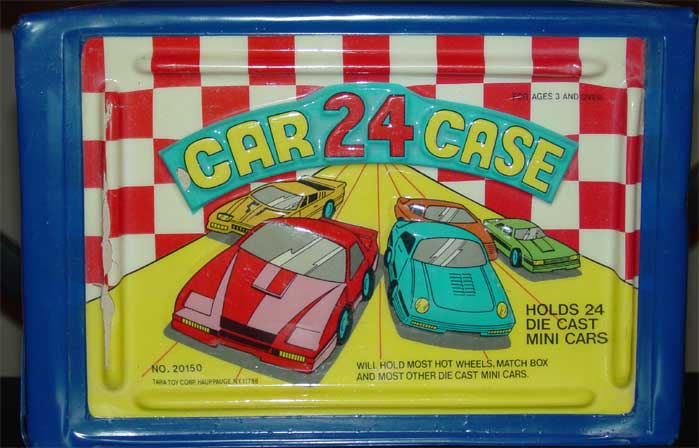 This Car Case no. 20150 is by Tara Toy Corp. Hauppauge NY. It holds 24 die cast mini cars such as Hot Wheels, Match Box and other die cast mini cars. The blue vinyl case has an embossed plastic front.