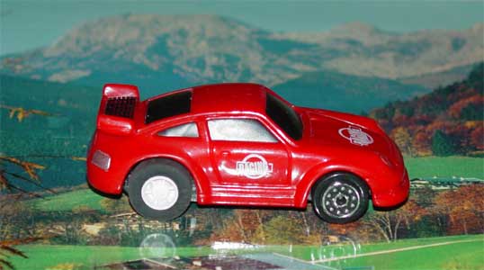An unmarked mini toy car with decals on the hood "118" and "Happiness Association". Made in China.