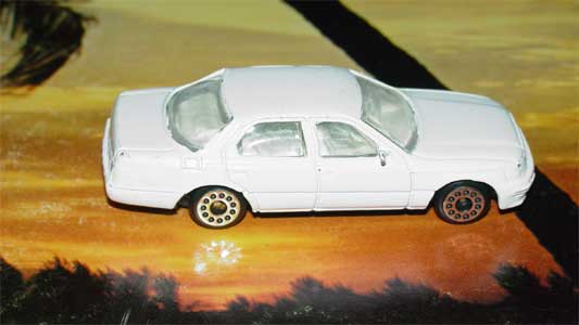 This "Match Box" size mini car is not marked with a manufacturer, date or brand. It is a white 4-door sedan.