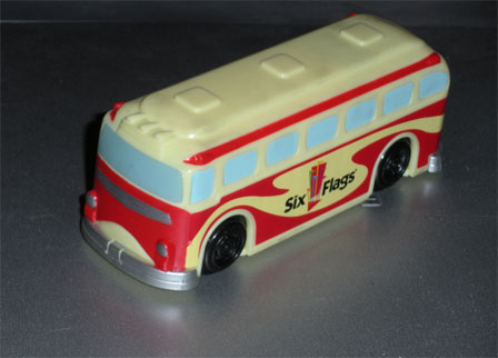 2005 Oldemark, LLC, Made in China, A Six Flags bus that is approximately 4 inches long and 1.25 inches tall.