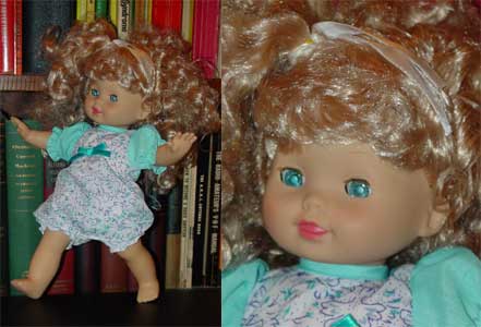 Blonde curly hair and blue open/close eyes with darker blonde eyelashes make this little 12 inch doll a cutie. She is tagged Toymate FTY LTD and appears to be wearing her original clothes. She is stamped 1991 on her head. She has a soft body with a viny head, arms and legs.