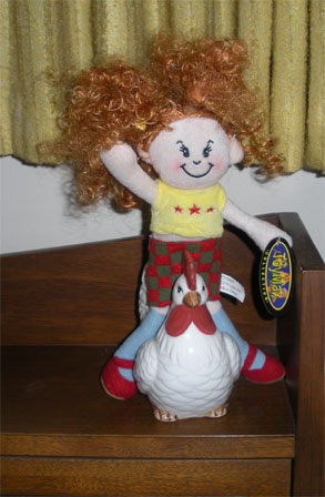 A Toy Max XYZ Plush doll who is approximately 10 inches tall. She has a determined look on her face and has red curly hair. She is wearing her original clothes.
