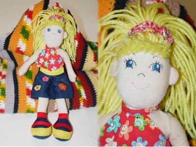 Unimax fashion doll with a soft body, yarn hair and an embroidered face. The doll is approximately 14 inches tall.