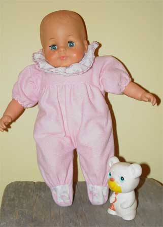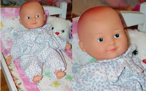 Unimax 11 inch baby doll marked 1996 on the head and tagged 2000. The blue and white sleeper appears to be the original clothes for this baby doll. A pleasant face that is nicely colored with painted on features and hair.