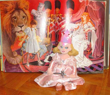 "Glinda", the Good Witch, from "The Wizard of Oz". Plush 13" doll designed exclusively for the now closed Warner Bros. Studios Store. Glinda is just one of the dolls in a discontinued set of dolls copyrighted by Turner Entertainment, 1998. "The Wizard of Oz" story, by L. Frank Baum, was originally published in 1900. The book showing in background is a beautiful 1991 edition published by JellyBean Press. The colorful illustrations throughout the book are a 1991 copyright by Charles Santore.